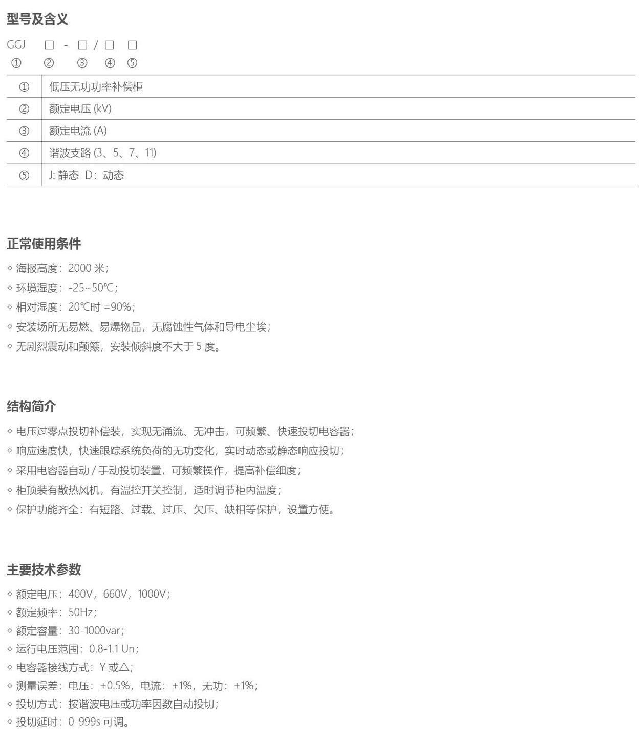 GGJ 低壓無功功率補償柜是針對電網實際情況而專門設計的,它采用先進的電力電子技術,智能控制技術,一方面有效解決了在諧波工況下并聯電容器自動投切無功補償的問題,另一方面可以根據用戶實際要求濾除諧波,清潔電網環境,降低損耗,消除諧波危害;并向系統提供容性無功,改善功率因數。可用于電力、冶金、石油化工、工礦企業、建筑、機械等行業配電系統中。