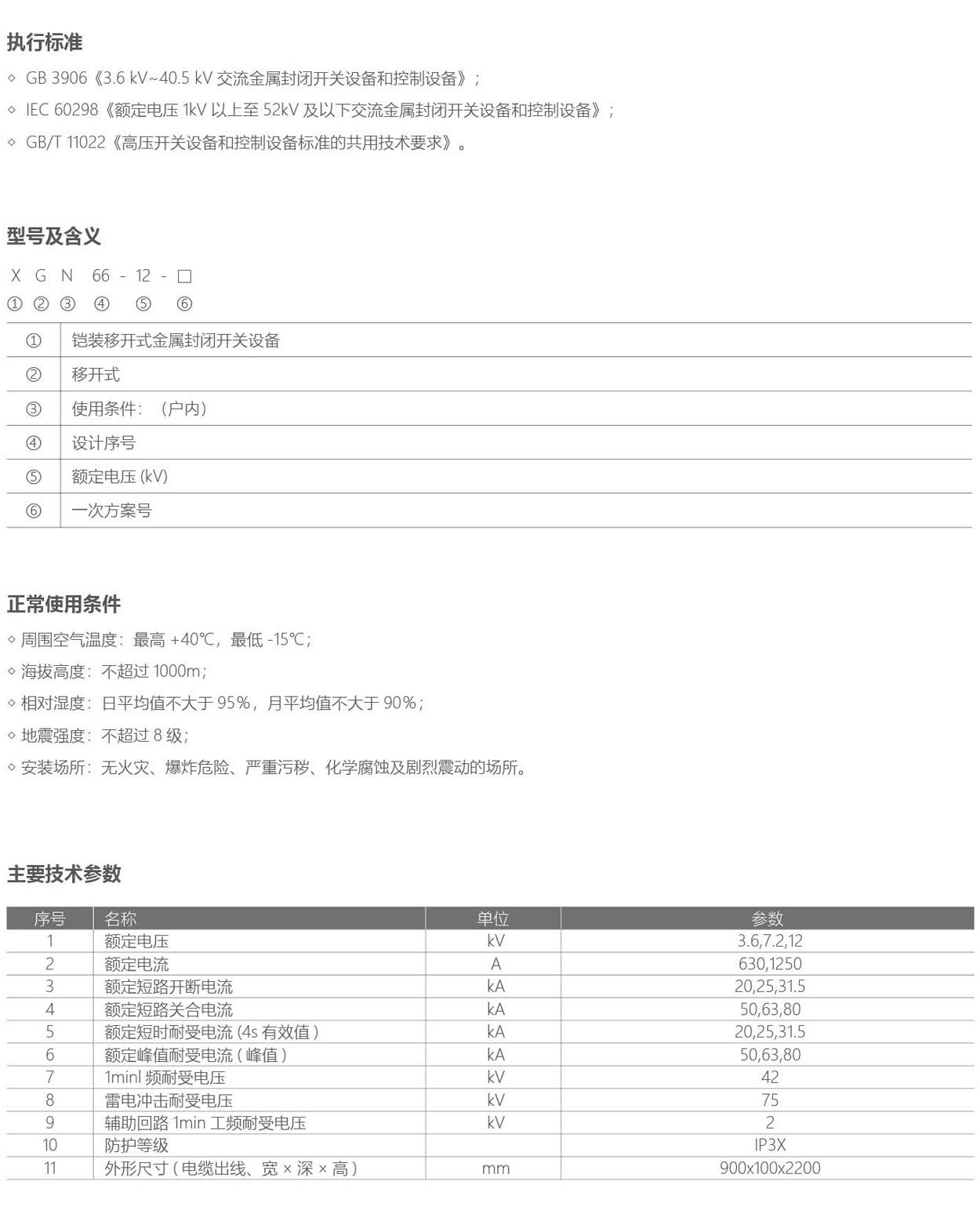 XGN66-12 箱型固定式交流金屬封閉式開關設備 ( 以下簡稱開關柜 ) 適用于 3.6~12kV 三相交流 50Hz 系統中作為接受與分配電能的裝置,適合于頻繁操作的場所和配裝油開關的開關柜改造之用。其母線系統為單母線系統和單母線分段系統...